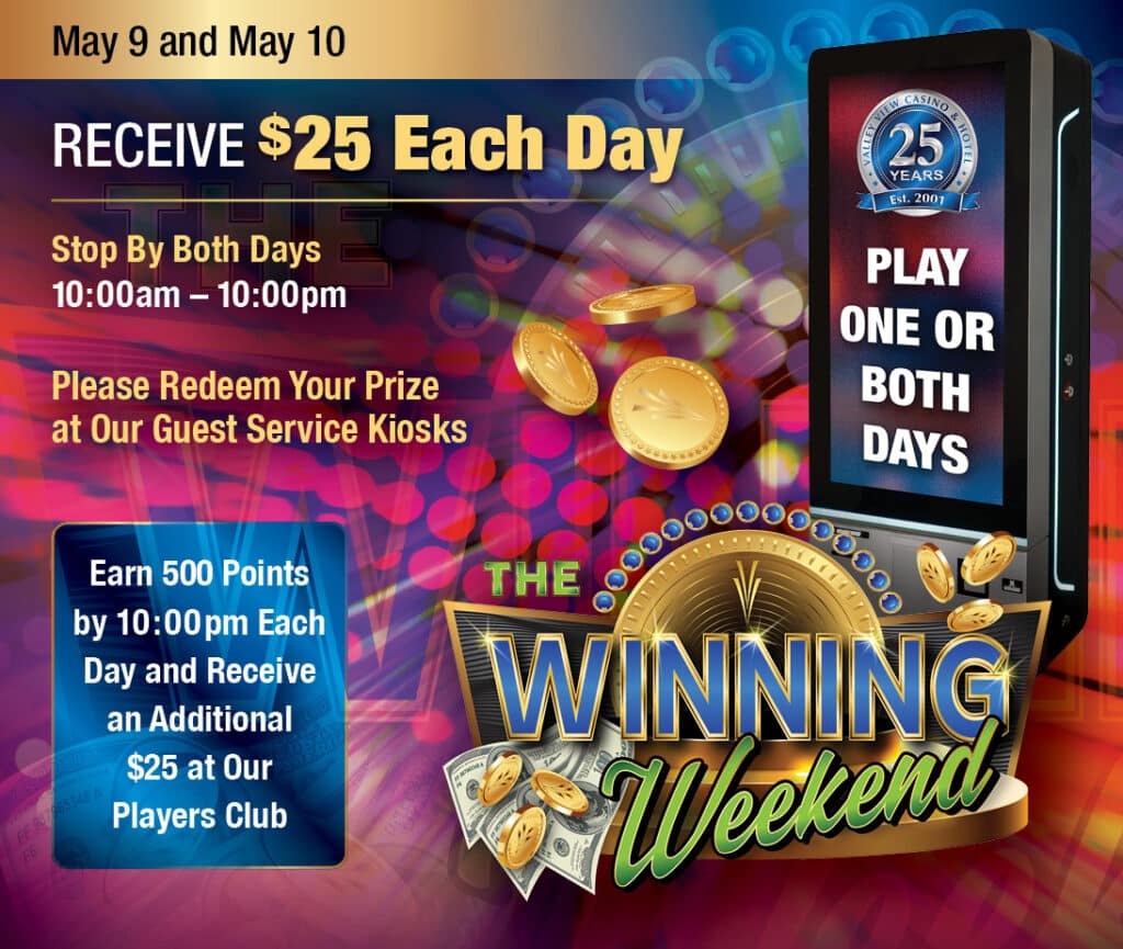 Los invitados pasarán su tarjeta de El Club de Jugadores en nuestros quioscos de servicio al cliente para recibir $25 al instante durante nuestro evento Winning Weekend que tendrá lugar el Sábado 10 de mayo y el Domingo 11 de mayo. Cada invitado puede participar en uno o ambos días.